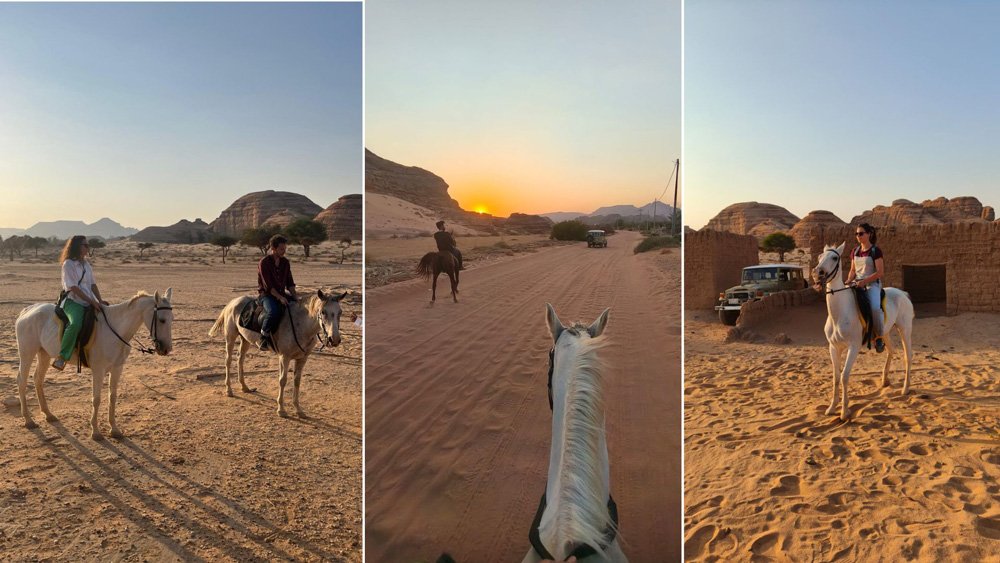 As the pace of work settled into its usual intensity, an unexpected encounter offered us a moment of genuine connection beyond the boundaries of the project. One afternoon, while simply looking for some batteries in a local shop, we struck up our first conversation with a young man whose kindness quickly transformed into an invitation: a horseback ride at his family’s farm behind Hegra. Needless to say that we accepted without hesitation. That evening, as the sun dipped toward the horizon, we rode through the desert among towering massifs, clusters of mud-brick houses, and quiet goat farms. The shifting light—turning the sandstone from gold to rose to deep amber—made every step feel like riding through a living painting.